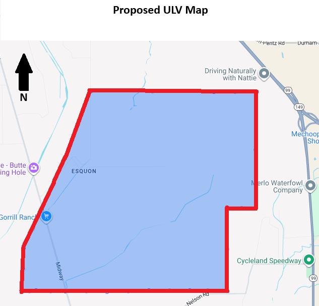 Planned aerial mosquito control application map for the Esquon area on 10/02/2025. The application will take place between sunset and 11:00 p.m.